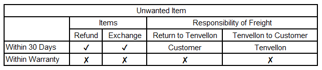 If the Tenvellon product that you purchased directly from Tenvellon does not meet your satisfaction or does not apply to your installation application (the “Product for Refund”), within 30 days after parcel delivered, you may return your product to Tenvellon for a full refund, unless otherwise specified in the products’ listing on our website, on the receipt or packing slip. You are responsible for the shipping fees. Beyond the end of those 30 days, refund and exchanges are not available.
